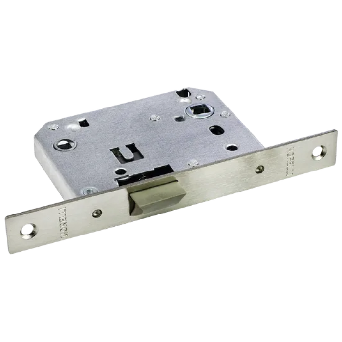 Сантехническая защелка с пластиковым язычком. Используется для бесшумного запирания дверей в сантехнические помещения. Межосевое расстояние 70мм.