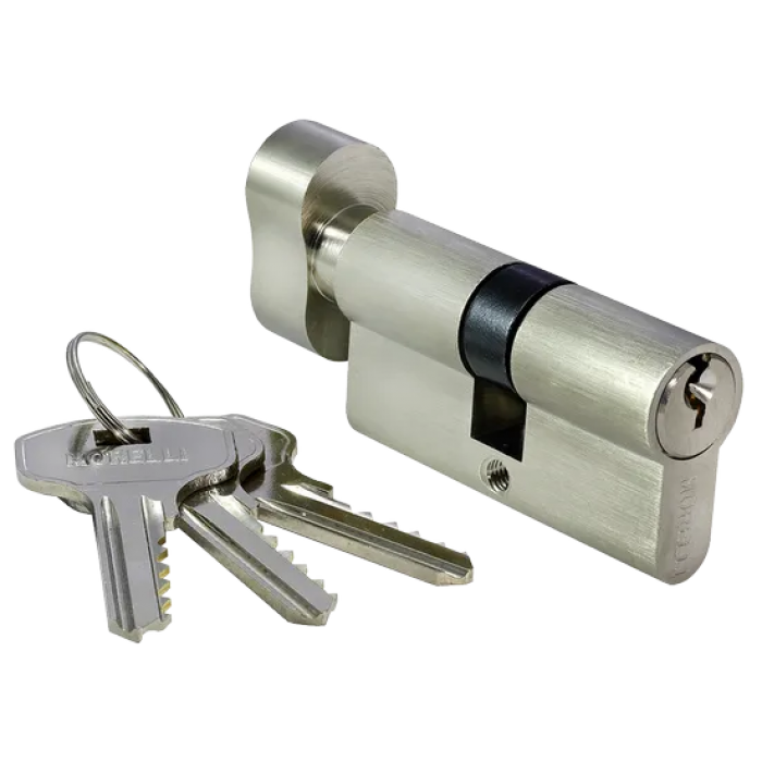 Ключевой цилиндр с заверткой для двери вставляется в замок или защелку для закрытия ключом с одной стороны помещения и поворота кноба с другой.