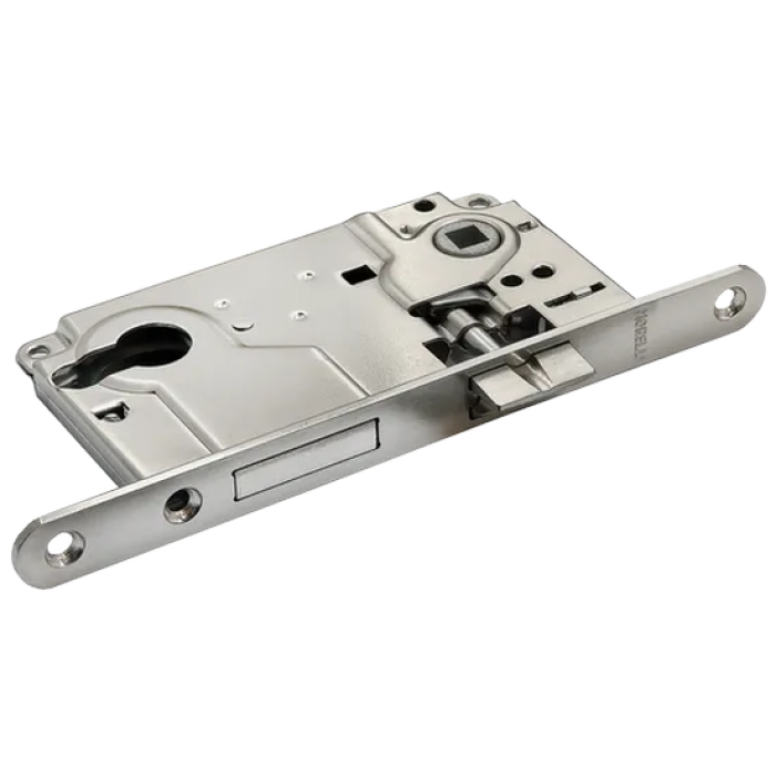 Замок с ригелем под ключевой цилиндр для межкомнатной двери комплектуется с ключевым цилиндром, соответствующим ширине полотна. Подходит для установки, например, на дверь кабинета. Для надежности запирания помимо обычного язычка, используется дополнительный ригель.