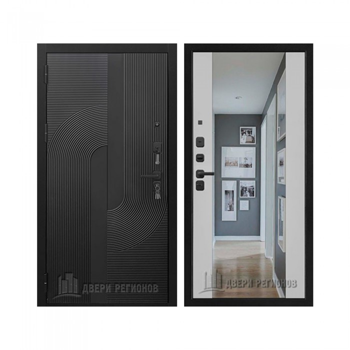 Дверь входная Орбита 3K Z, цвет Чёрная Мягкая Шагрень, панель - Орбита Зеркало цвет ПВХ Белая Мягкая Шагрень