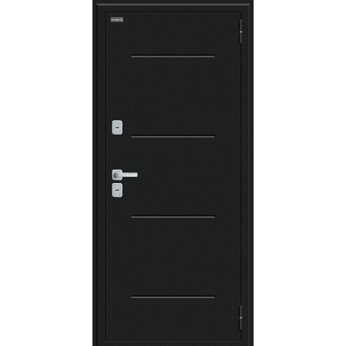 Стальной дверной блок энергосберегающей конструкции с двойным терморазрывом (термомостом) из натуральной пробки и четырехконтурным уплотнением. Поставляется с правым и левым открыванием наружу.