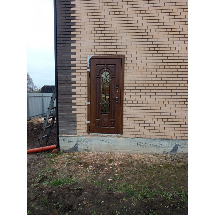 Внешняя отделка металлической входной двери Термо Лацио выполнена из влагостойкого 16 мм МДФ цвета «Золотой орех» с патинированным покрытием Vinorit со стеклопакетом с коваными элементами.